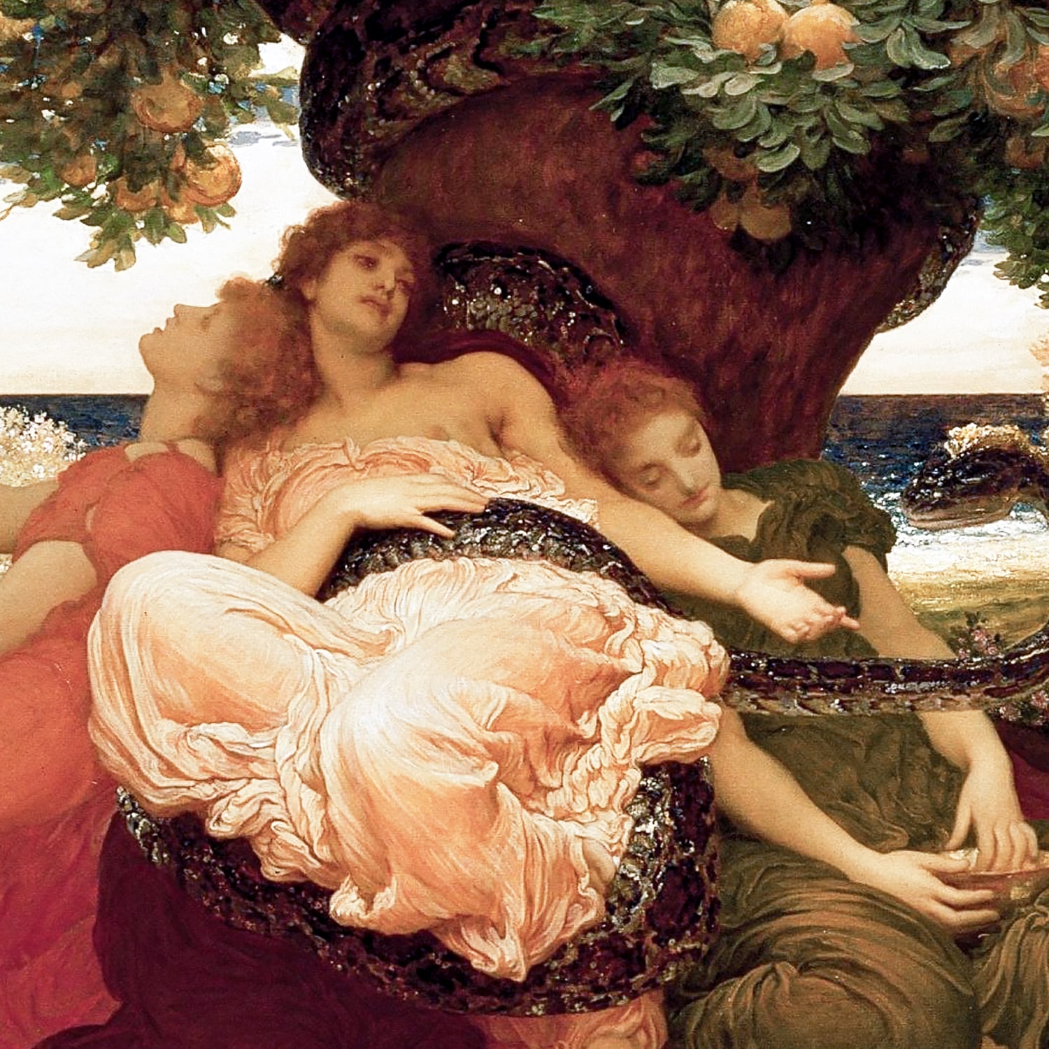 LE JARDIN DES HESPÉRIDES : en marge du monde, vers l’empire de la Nuit, se trouve le jardin des Hespérides qui abrite un arbre aux pommes d’or. Gaïa (la déesse de la terre) a offert ces fruits à la déesse Héra qui les a fait garder par un serpent-dragon immortel et trois nymphes du soir. L’or qui est un métal presque inaltérable représente le symbole de l’éternité des dieux. Pour le onzième de ses travaux, Héraclès (Hercule) a dû voler l’une des pommes alors que la loi divine interdisait de les extraire du jardin sacré. Mythe grec.