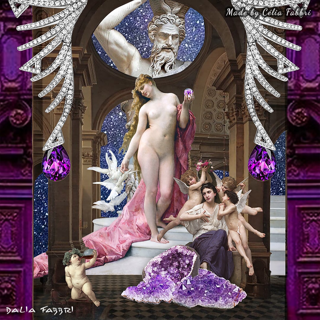 AMETHYSTOS : issue de la mythologie grecque. Pour échapper aux ardeurs du dieu Dionysos, la nymphe Amethystos a demandé l’aide de la déesse Artémis. Cette dernière a répondu à sa demande en la transformant en pierre. Le dieu, pris de dépit, a renversé son précieux vin sur la pierre et lui a donné ainsi sa sublime couleur violine.
