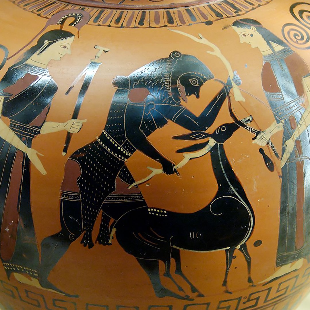 BICHE DE CÉRYNIE : créature fantastique de la mythologie grecque aux cornes dorées et aux sabots d’airain. Sous la protection d’Artémis, il est interdit de la toucher et encore moins de la tuer. Pourtant, lors de l’un de ses douze travaux, le demi-dieu Héraclès a dû la capturer. Il a poursuivi l’animal pendant une année sans jamais réussir à l’atteindre car la bête est bien trop rapide. La biche a fini par s’épuiser et se réfugier sur le mont Artémision. Héraclès lui a décroché une flèche entre l’os et le tendon de la patte, l’immobilisant sans la faire saigner. En chemin, il a rencontré Artémis qui l’a accusé de blasphème et pour calmer sa colère, il lui a promis de relâcher la bête sans la blesser une fois qu’il aurait démontré la réussite de son acte.